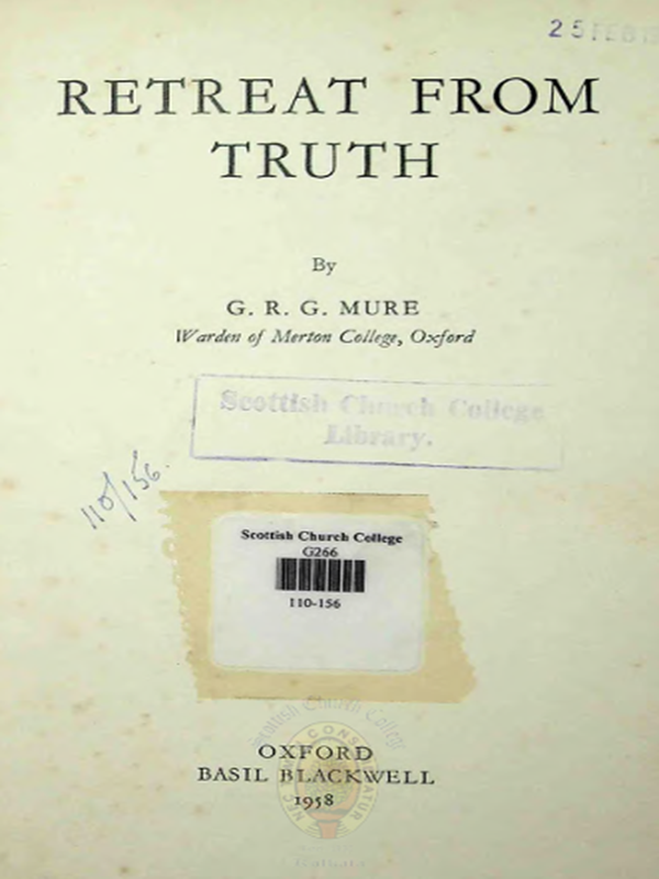 G. R. G. Mure’s Retreat from Truth (1958) is a profound philosophical exploration of the decline of objective thinking in modern times. Mure examines the tendencies in contemporary philosophy that move away from classical rationalism and metaphysical inquiry toward subjectivism and relativism. Through critical engagement with major thinkers and schools of thought, he defends the enduring value of truth, logic, and philosophical reasoning. Written in a lucid and rigorous style, the book reflects Mure’s deep engagement with Hegelian philosophy and his concern for preserving intellectual integrity in an age of skepticism. It remains a significant contribution to twentieth-century philosophical discourse.